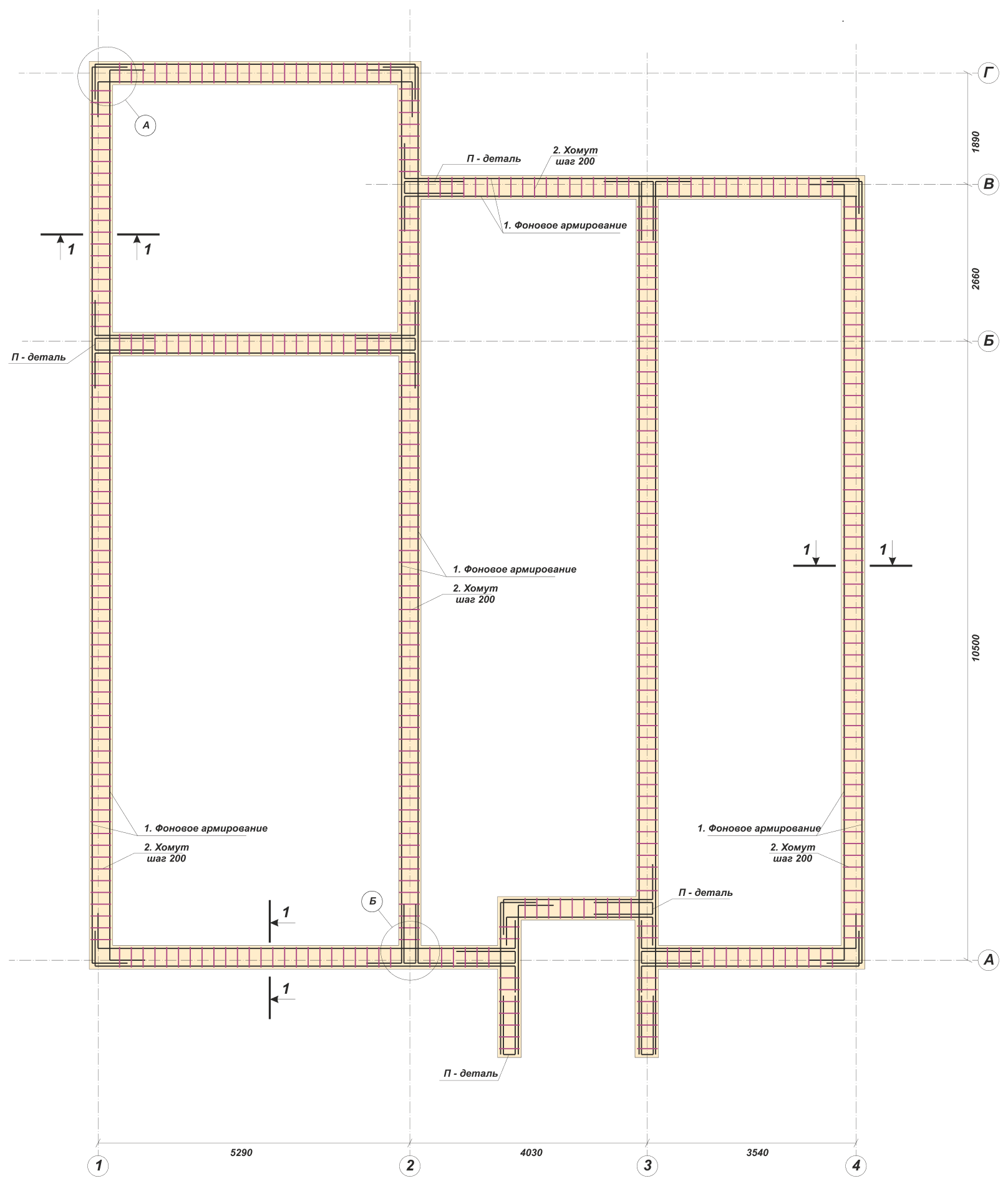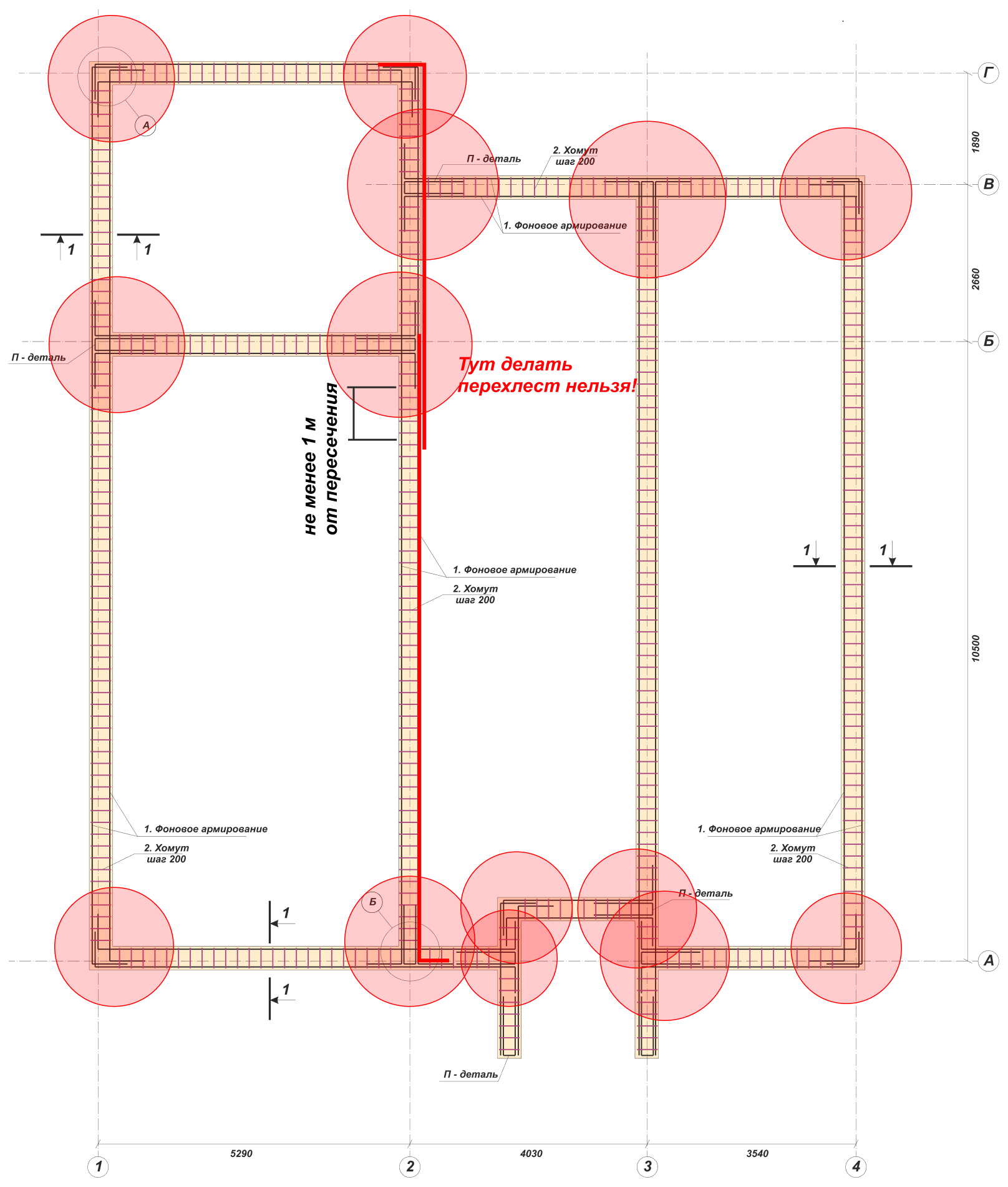 Нахлест в угловых точках Принципиально важно избегать нахлестов стержней продольной арматуры ближе, чем 0,5 м от угловых точек каркаса, и недопустимо непосредственно в этих точках.