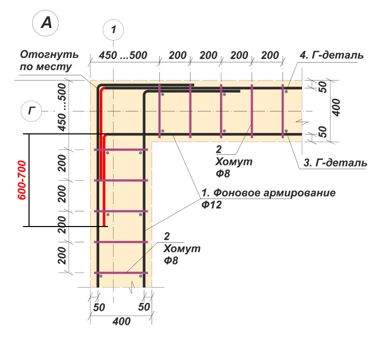 Угол армкаркаса – это зона концентрации напряжений всех его элементов. Нахлест (а он изначально менее жесток, чем целый стержень) делает такие участки уязвимыми. Кроме того, именно с целью придания каркасу жесткости, в угловых точках используют такие элементы, как Г- и П-детали (перемычки), и дополнительные хомуты. Нахлест продольных стержней в углах затруднит качественную обвязку всех элементов конструкции.